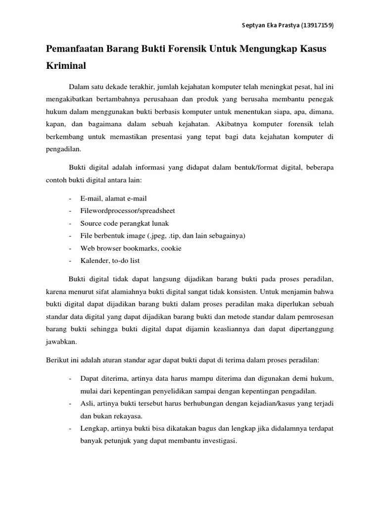 Digital forensik memiliki beberapa pengertian dari beberapa sumber yaitu. Barang bukti sangat penting dalam melakukan investigasi terhadap kasus kejahatan komputer maupun yang berkaitan seperti kejahatan online lainnya. Forensik digital diperlukan karena biasanya data di perangkat target dikunci dihapus atau disembunyikan. 2 jurusan magister teknik informatika fakultas industri universitas islam indonesia 1 2 jl.