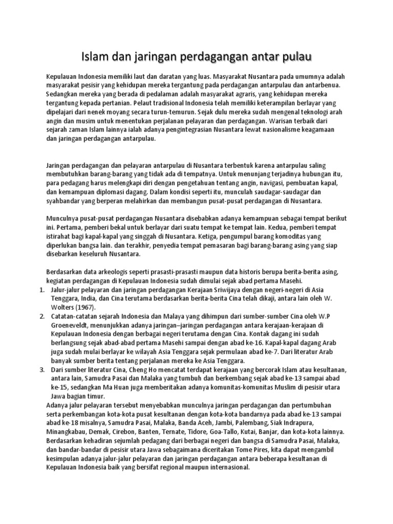 Barang dagangan utama antarpulau yang berasal dari daerah sumatera. Bahkan pada abad ke 2 indonesia telah menjalin hubungan dengan india sehingga agama hindu masuk dan berkembang. Berita dari dinasti chi selatan 479 502 yang menerangkan adanya perdagangan sutera antara negerinya dengan pedagang pedagang yang datang menumpang kapal kun lun sebutan bagi bangsa bangsa yang berasal dari lautan selatan. Barang dagangan utama yang mendapat prioritas dalam perdagangan antarpulau yaitu. Jaringan perdagangan dan pelayaran antar pulau di indonesia telah dimulai sejak abad pertama masehi.
