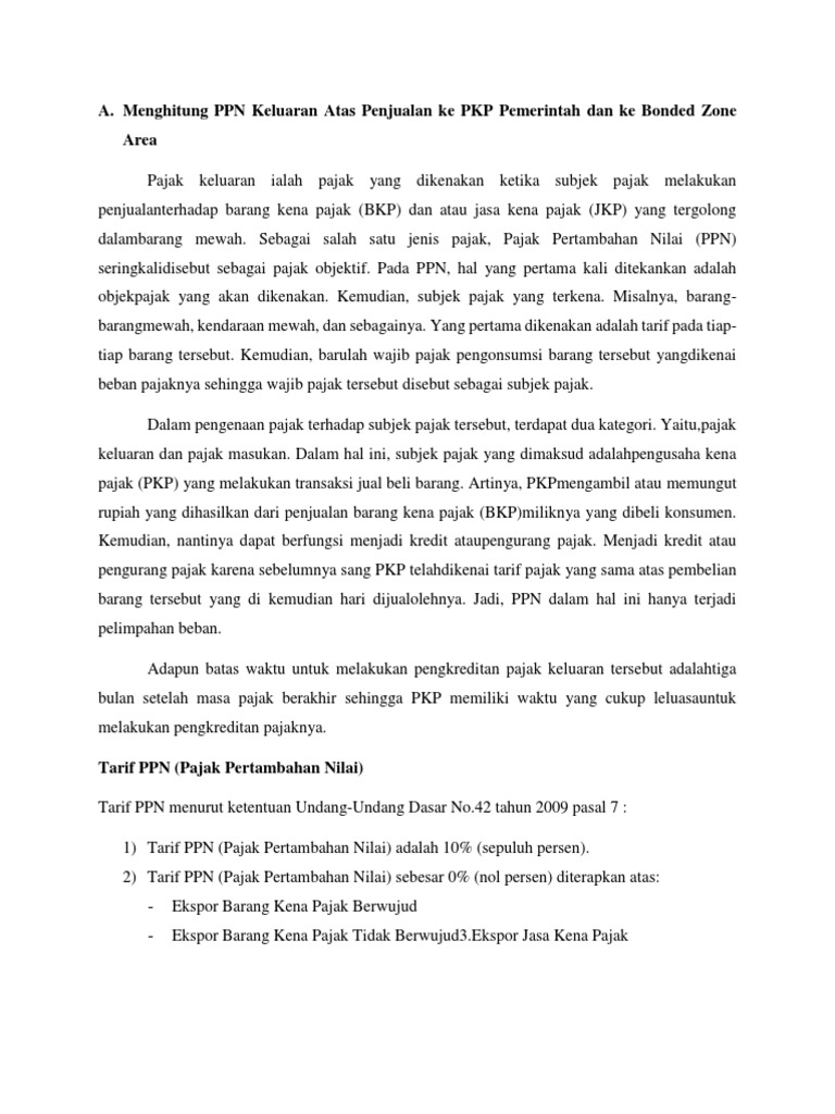 Ekspor barang kena pajak bkp berarti akan menyebabkan bkp tersebut dikonsumsi di luar daerah pabean. Tarif ppn 10 berlaku untuk semua produk yang beredar di dalam negeri termasuk di daerah zona ekonomi eksklusif dan landas kontinen yang di dalamnya berlaku undang undang yang mengatur tentang kepabeanan. Hanya beberapa saja yang dianggap sebagai komoditas yang perlu perlindungan sehingga diberikan pajak dengan angka tertentu. Jasa perbaikan dan perawatan yang memenuhi syarat bahwa jasa yang dijalankan dimanfaatkan di luar daerah pabean.