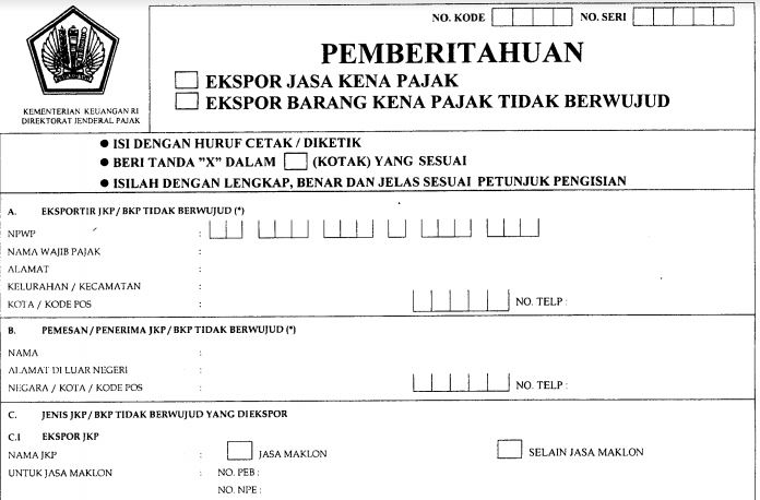 Pkp yang melakukan ekspor jkp wajib membuat pemberitahuan ekspor jkp dengan formulir yang telah ditetapkan dalam lampiran peraturan menteri keuangan nomor 70 pmk 03 2010 pada saat ekspor jkp. Objek dari pajak ekspor merupakan jkp jasa kena pajak dan bkp barang kena pajak. Objek pajak ekspor adalah barang kena pajak bkp dan jasa kena pajak jkp. Semua perubahan ini selanjutnya kita sebut undang undang pajak pertambahan nilai uu ppn.