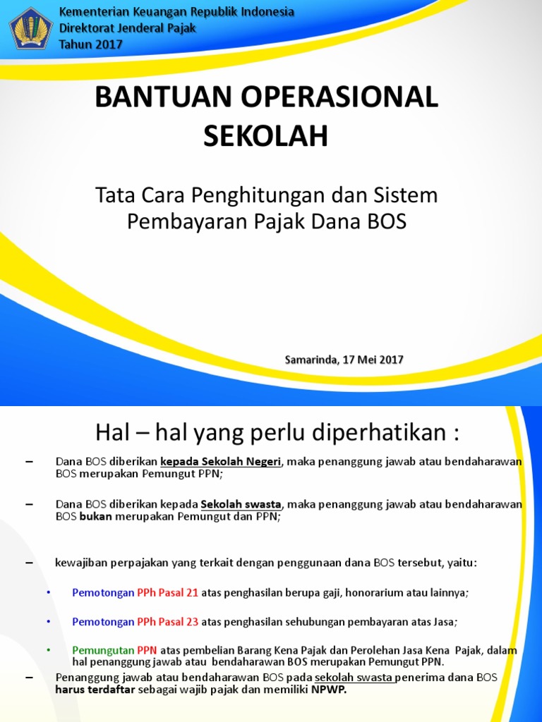 Selain itu kepala sekolah diberikan otoritas dalam mengelaola dana bos tersebut didalam keadaan force majeure seperti dalam kondisi darurat bencana. Pajak ini menjadi tanggungan penjual selaku pihak yang memperoleh penghasilan. Penanggung jawab atau bendaharawan bos pada sekolah swasta penerima dana bos harus terdaftar sebagai wajib pajak dan memiliki npwp. Bantan operasional sekolah atau bos adalah program pemerintah.