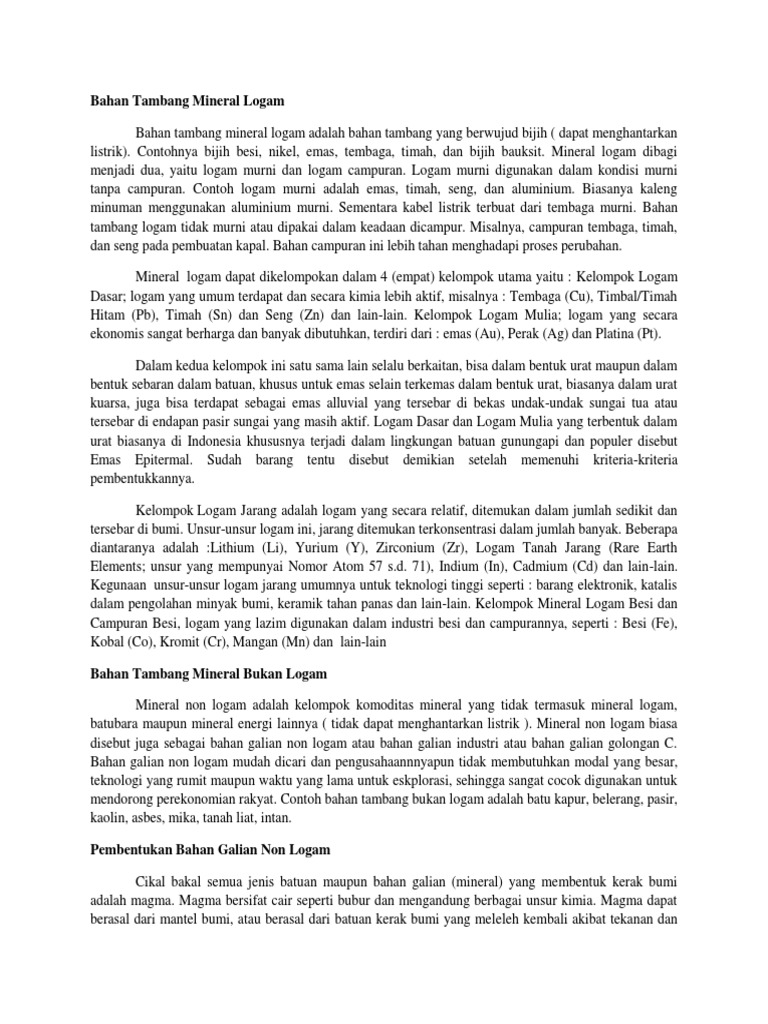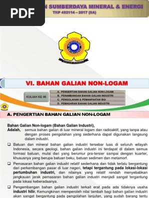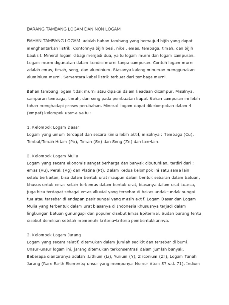 Mineral non logam 17 13 00. Logam murni digunakan dalam kondisi murni tanpa campuran. Agar kita paham tentang sumber daya alam yang kita miliki apalagi tentang barang tambang mineral non logam dan kita akan lebih tahu manfaat yang terdapat dari barang tambang mineral non logam. Beberapa literatur mendifinisikan pengertian nilai tambah mineral logam sebagai usaha untuk meningkatkan nilai ke ekonomian suatu hasil tambang melalui pemprosesan dan pemurnian sehingga menghasilkan dampak pada kemanfaatan lebih tinggi pada produk yang dihasilkan dan memberikan multiplier effect pada pengembangan industri hilir yang terkait the govt.