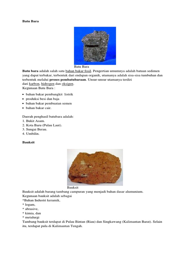 Batubara jadi salah satu bahan bakar fosil yang banyak dimanfaatkan dalam kehidupan manusia. Batu bara adalah barang tambang yang multifungsi. Barang tambang adalah sumber daya alam yang berasal dari dalam perut bumi dan bersifat tidak dapat diperbarui. Batubara adalah barang tambang yang berasal dari sedimen bahan organik dari berbagai macam tumbuhan yang telah membusuk dalam waktu yang sangat lama dan di area dengan karakteristik kandungan air cukup tinggi.