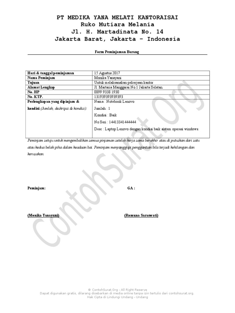 Contoh Surat Peminjaman Barang Perusahaan