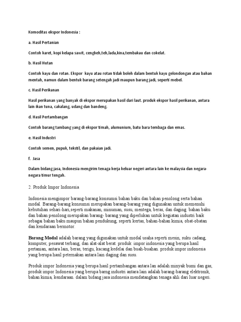 Komoditas industri dan kerajinan komoditas industri dan kerajinan meliputi berbagai produk yang sudah melewati proses pengolahan hasil olahan ini bisa berupa barang jadi atau barang setengah jadi. Sekda menjelaskan upaya pemprov jambi untuk mendorong ekspor komoditi pertanian tersebut dituangkan dalam surat keputusan sk gubernur. Salah satu langkahnya dengan melakukan ekspor. Kami mendorong para eksportir agar tidak lagi mengekspor komoditas mentah ke luar negeri.