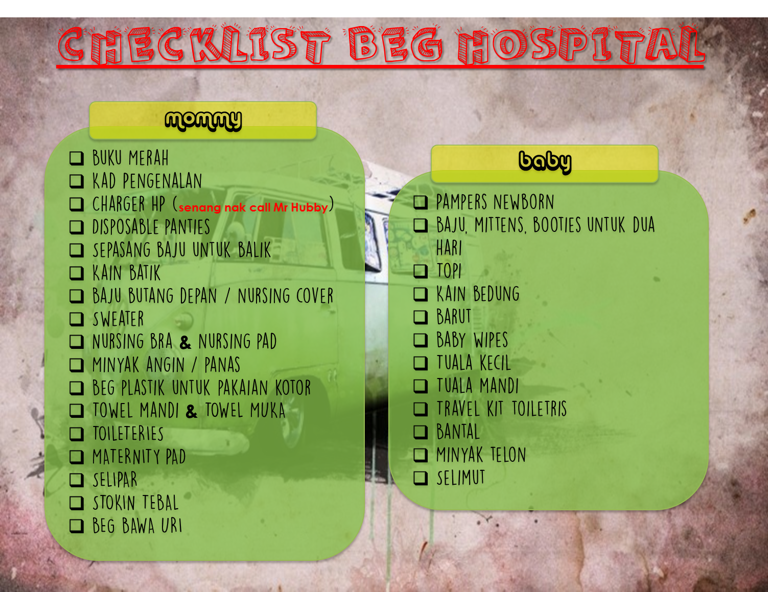 Sebagai satu projek komuniti daripada senarai ini kami akan sediakan fail dalam bentuk pdf yang boleh di muat turun. Masuk minggu 36 aku dah standby siap2 bag dan isinya. Kat sini aku list kan semula barang2 tu untuk double check kot2 ada plak yang ter miss. Jangan risau kami senaraikan barangan apa yang anda perlu masukkan dalam checklist.