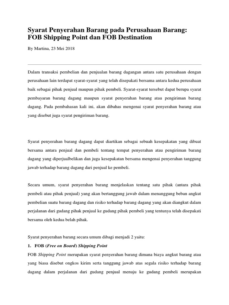 Syarat penyerahan barang fob shipping point dan fob destination point. Maksudnya disini aialah pada saat terjadi transaksi pembelian barang dari penjual tetapi barang terkait sedang dalam. Ridha cn 125030200111070 dalam proses pembelian barang dikenal dua istilah yang merupakan syarat jual beli yaitu fob shipping point dan fob destination point kedua istilah ini menggaris bawahi kapan barang yang dibeli bisa diakui sebagai hak milik pembeli. 2 jenis biaya angkut untuk pembelian barang dagang adalah. Demikianlah pembahasan tentang syarat penyerahan barang baik fob shipping point franco gudang penjual maupun fob destination point franco gudang pembeli.